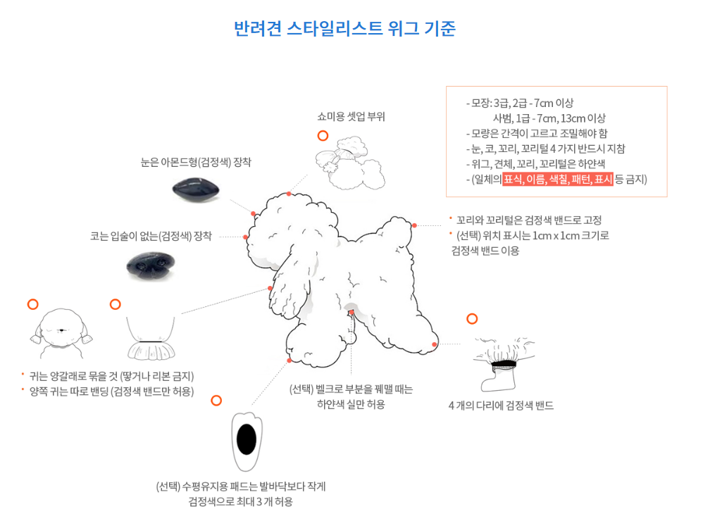 - 위그 (시험실 입실 전 브러싱 완료)와 견체 모형은 모두 수험자가 지참하고 시험실에 입실. 위그의 체결 방식은 단추, 걸이, 벨크로 등 제한 없음 / 위그 (귀, 꼬리털, 체결부위 포함)와 견체모형, 꼬리뼈는 모두 하얀색에 어떠한 패턴, 표시, 표기, 부착물, 훼손, 변형 금지 ※ 모량이나 밀도가 외관상 일정한지 점검. 일정하지 않을 경우 작업 위치 사전 표시 여부로 논란이 될 수 있음 / 견체 모형(꼬리뼈 포함)은 하얀색의 딱딱한 재질에 모든 다리 부위가 움직일 수 있어야 하고 부착물, 표시, 표기가 없어야 하며 훼손 또는 변형 금지 ※ 구매 시점이나 방법 (인쇄, 부착 등)에 관계없이 일체의 표시나 부착물 금지 (예: 제조업체명, 상표명, 로고 등) / 배의 벨크로 부분을 꿰맬 필요가 있을 경우 하얀색 실만 사용 시험실의 테이블에서 위그의 머리는 수험자의 오른손 방향에 위치 / 털길이 (잡아당김 없이 자연 상태에서의 최소 길이) 2급, 3급: 모두 7cm 이상( 사범, 1급은 머즐, 셋업부위, 메인코트는 13cm 이상, 기타 부위는 7cm 이상 ) / 눈, 코, 꼬리 및 꼬리털 : 모두 준비해서 입실, 눈은 아몬드형, 코는 입술이 없는 검정색만 허용 꼬리털은 견체에 검정색 밴드로 고정하고, 작업은 견체에 부착 후 시작, 털/밴딩 : 다음과 같이 사전에 준비하여 시험실에 입실 양 갈래로 묶는 것만 허용 (땋거나 코반 등 사용 금지) 양쪽 귀를 따로 밴딩 , 쇼미용은 셋업 부위의 털을 한 개로 밴딩. (이미지너리 라인의 구분은 패턴 표시로 간주될 수 있으므로 눈이 가려지도록 밴딩) 발/다리 : 모든 다리 부위의 털은 견체의 발목부위에 검은색 밴드로 고정 ※ 【선택】 수평유지 등 필요 시 총 3개 이하의 발바닥 부위에 발바닥 보다작은 크기로 검은색 패드 부착 모델견용 모든 밴드는 실견에 통상적으로 사용하는 재질의 검은색
